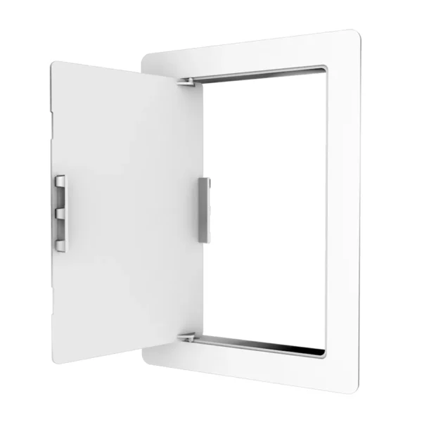 Constructed from durable 3mm thick high-impact styrene plastic with UV stabilizers, ensuring longevity without fading or corrosion. The textured white surface allows for painting over to match any decor. The flush plastic door features a picture frame detail and a simple pin hinge, allowing for complete removal. The panel can be opened using a coin or flat head screwdriver.