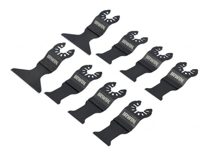 SKU#: IW1017112IRWIN® 8 Piece Oscillating Blade Set. Suitable for cutting a range of common materials; wood, plasterboard, PVC and nail embedded wood. Ideal for use on renovation jobs. Contains:
